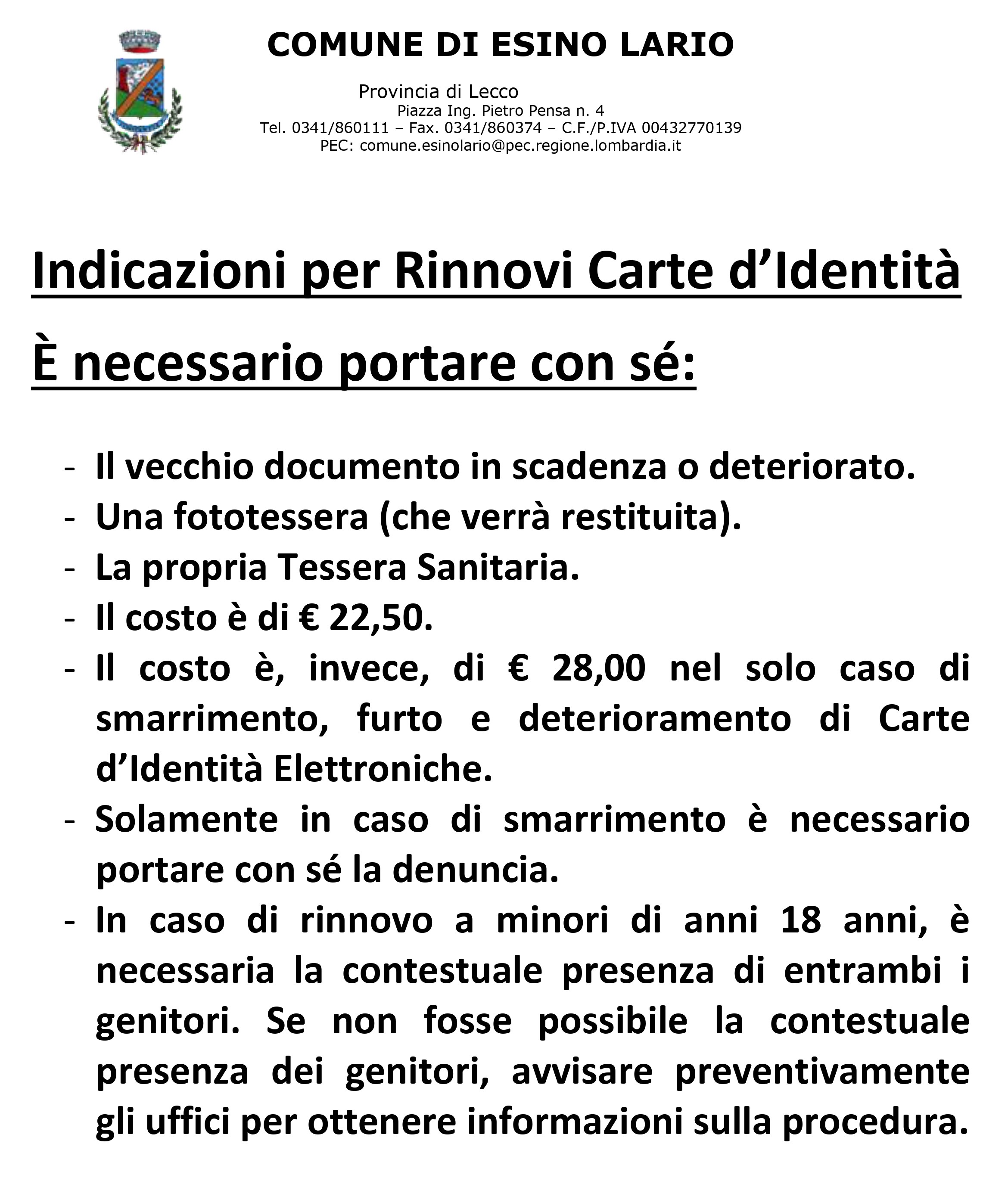 Indicazioni per i Rinnovi delle Carte d'Identità